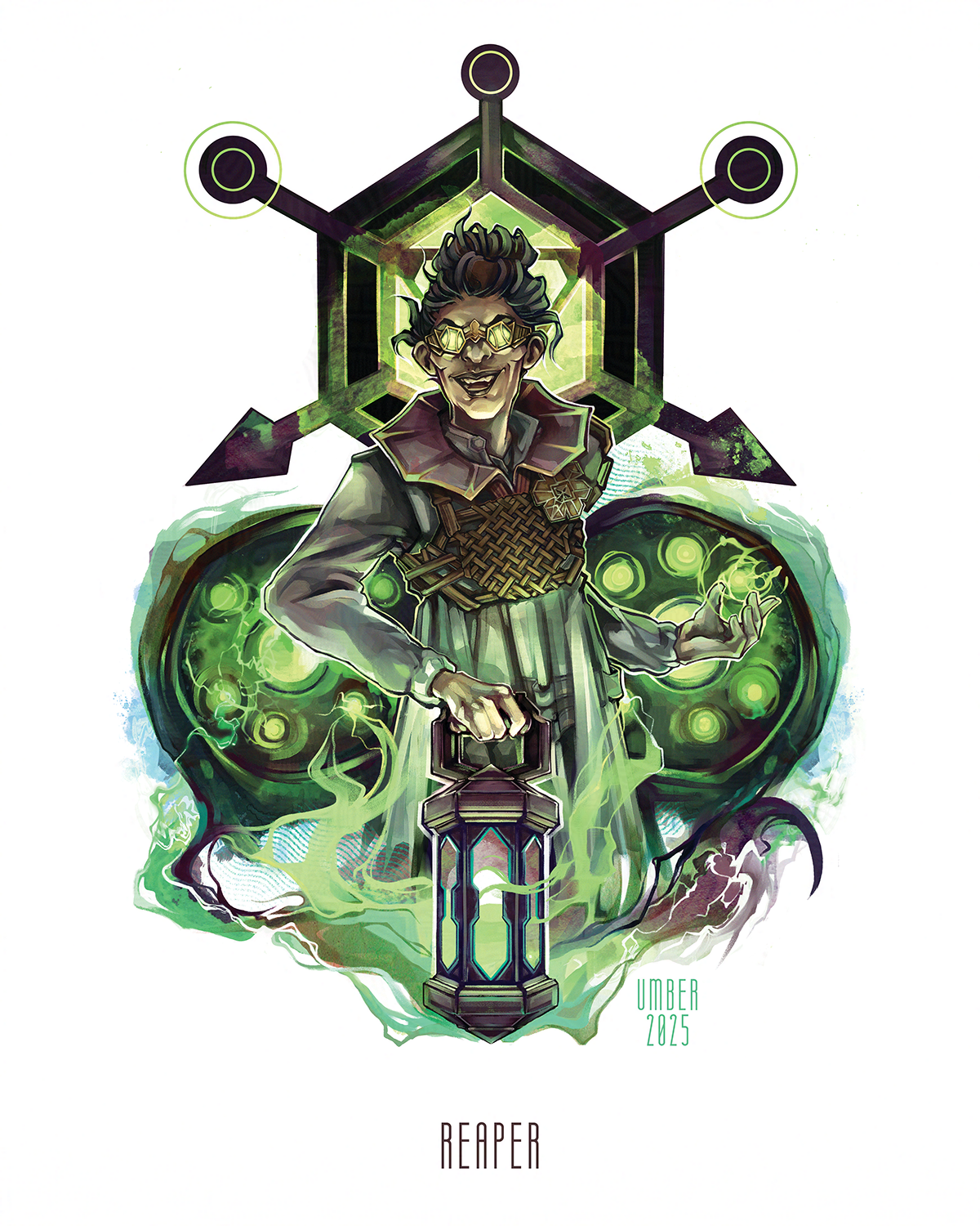 Johanna Hezenkoss from Dragon Age: The Veilguard is depicted from the upper thighs up - facing forward and holding the gloaming lantern in front. She's got a wild grin, messy long hair tied in a loose bun, and she's wearing her trademark goggles that glow with eerie light. Behind her is a stylized depiction of the bone colossus's eyes and skull crest, which warp around her and blend with the green energy escaping from the lantern. If I never have to paint wicker again it'll be too soon.