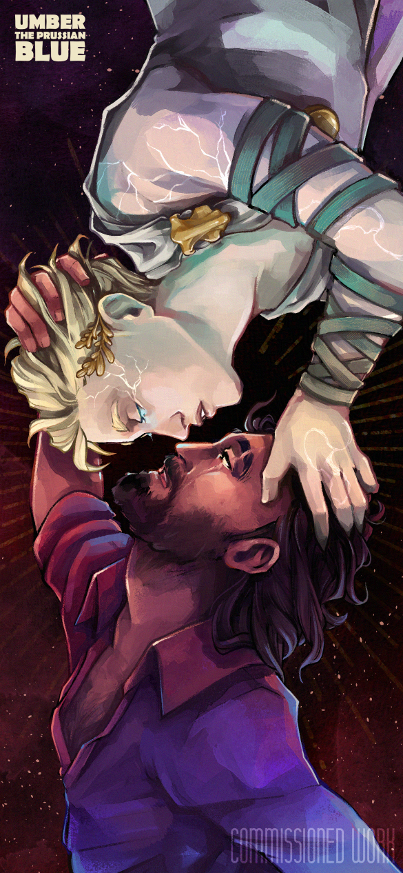Image depicts a man with long blue hair tied in a very loose bun that is falling around his narrow face and shoulders. At his forehead and into his hair line are similarly blue feathers that create a kind of messy crest like a bird might have. His left eye is bright magenta with arcing energy that springs from the pupil up over his browline and spreading over the side of his face in white hot runic symbols. His right eye, though mostly hidden by a 3/4 view, is clearly a natural color. He wears a forlorn, but elegant expression.