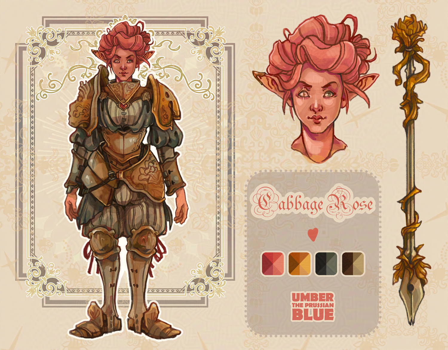 A character sheet showing a femme character in decorative gold armor and pantaloons. She has pink gibson girl-like hair, a false eye, and a cute smile. Beside her is her weapon, a fountain pen shaped sword with a cabbage rose pommel