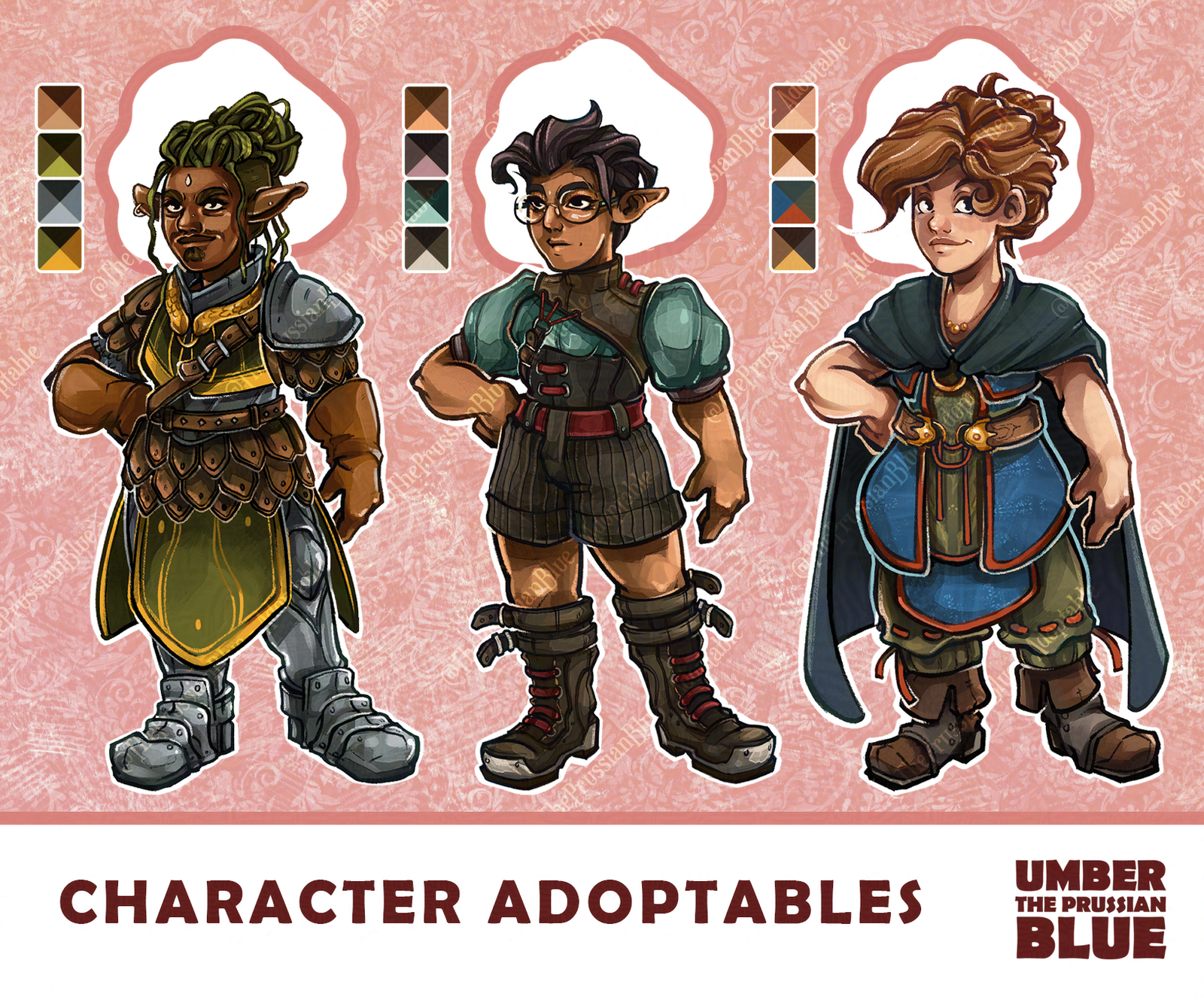 A set of three chibi adventurer adopts. The first is a black man with leaf green dreds held in a loose bun. He's wearing leather and steel armor and has a golden snake clasp around his neck. The second is a nonbinary person with olive skin, they have black, messy short hair, heavy boots, and a corset with shorts combo outfit. The third is a long haired ginger woman with a tunic and cloak