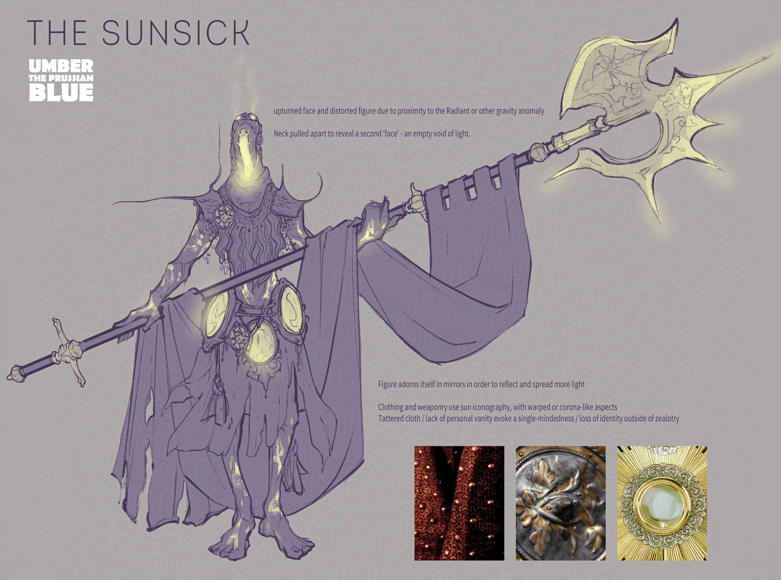 concept design of a twisted figure with an upturned face and giant halberd. Their design echoes elements of the sun, with mirrors and inner light