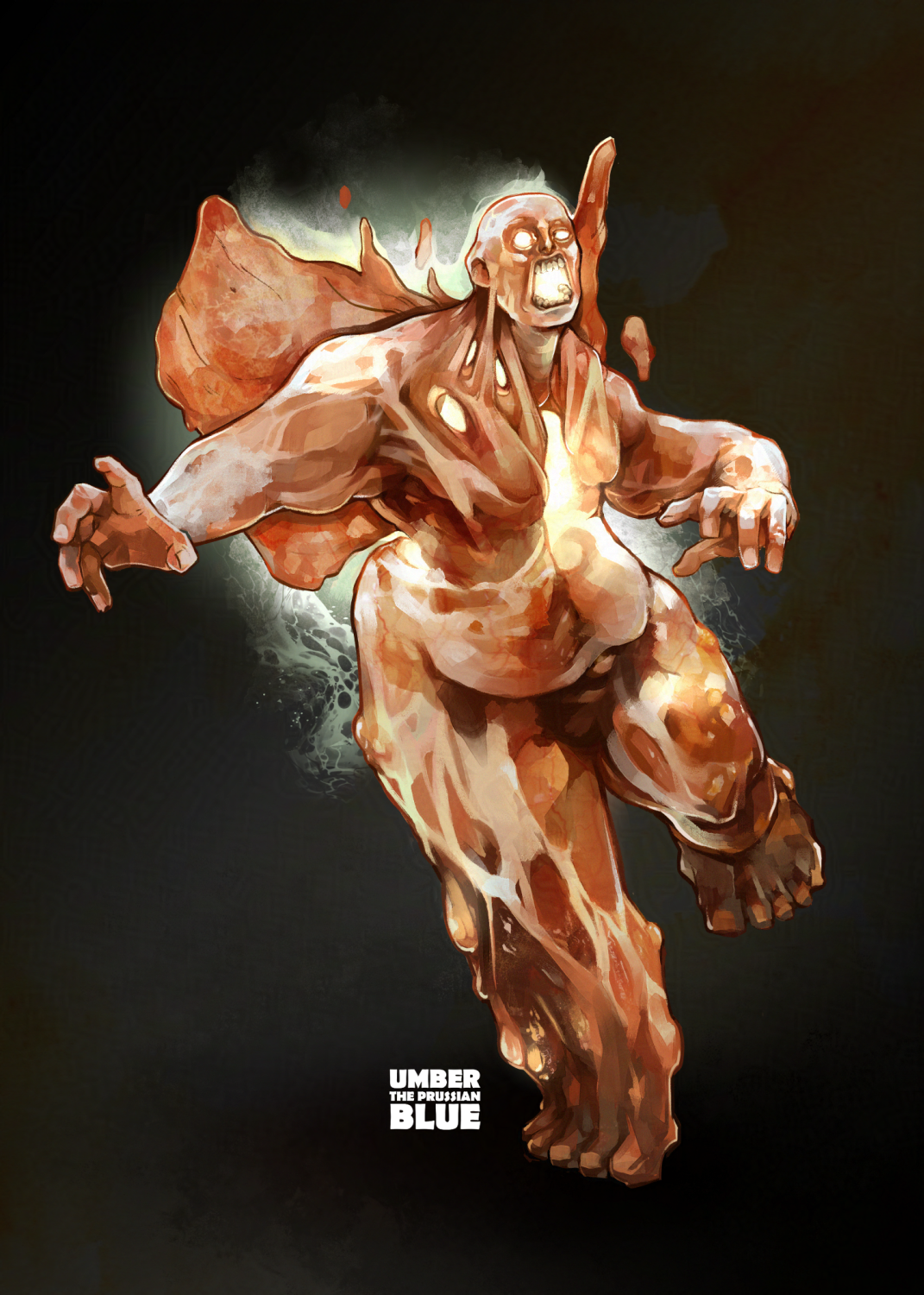 Illustration shows a nude zombie-like creature covered in stricture-type scars, blisters, and burned skin. It's back is flayed open like wings, and the center of its body is a cavernous void of bright, white light.